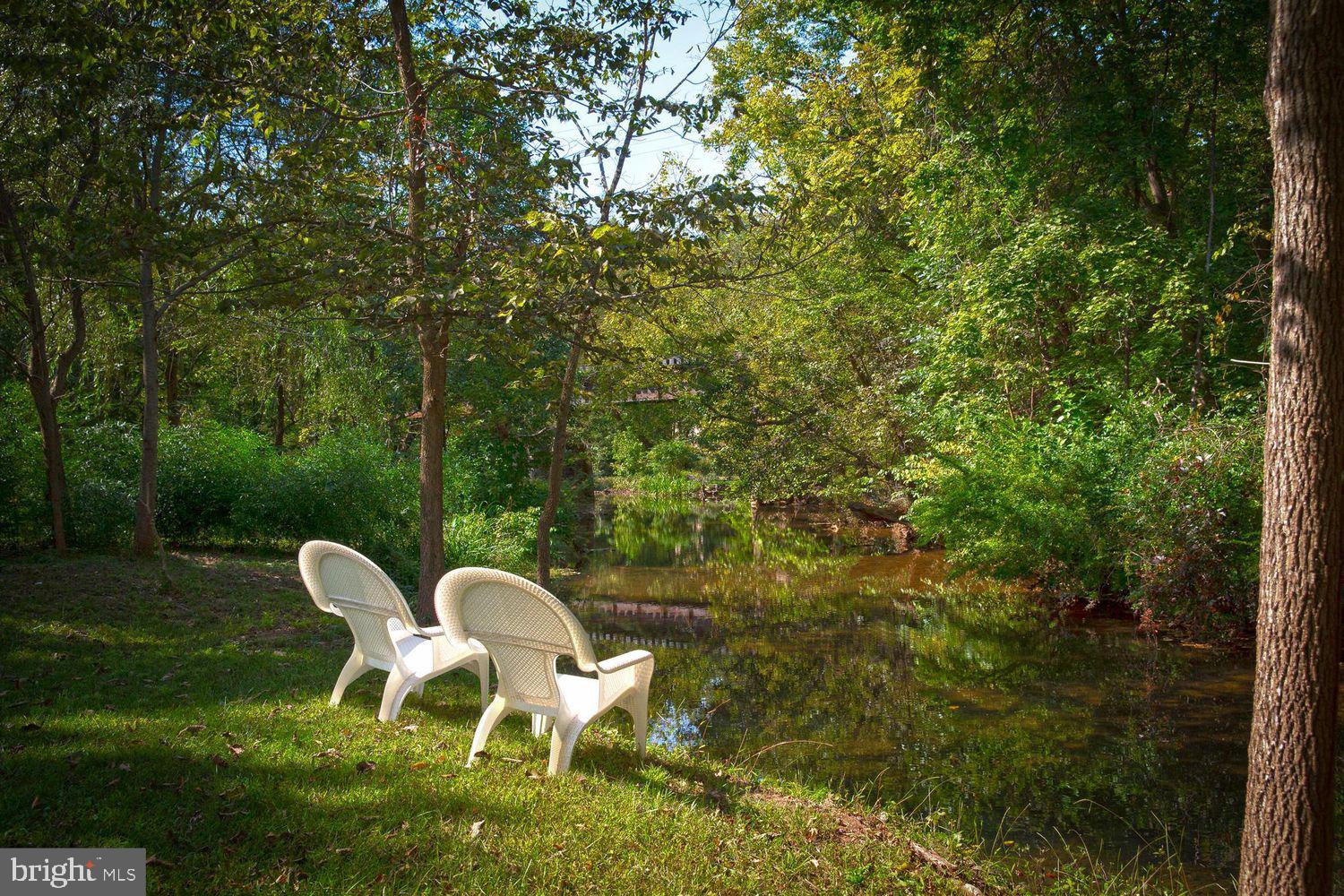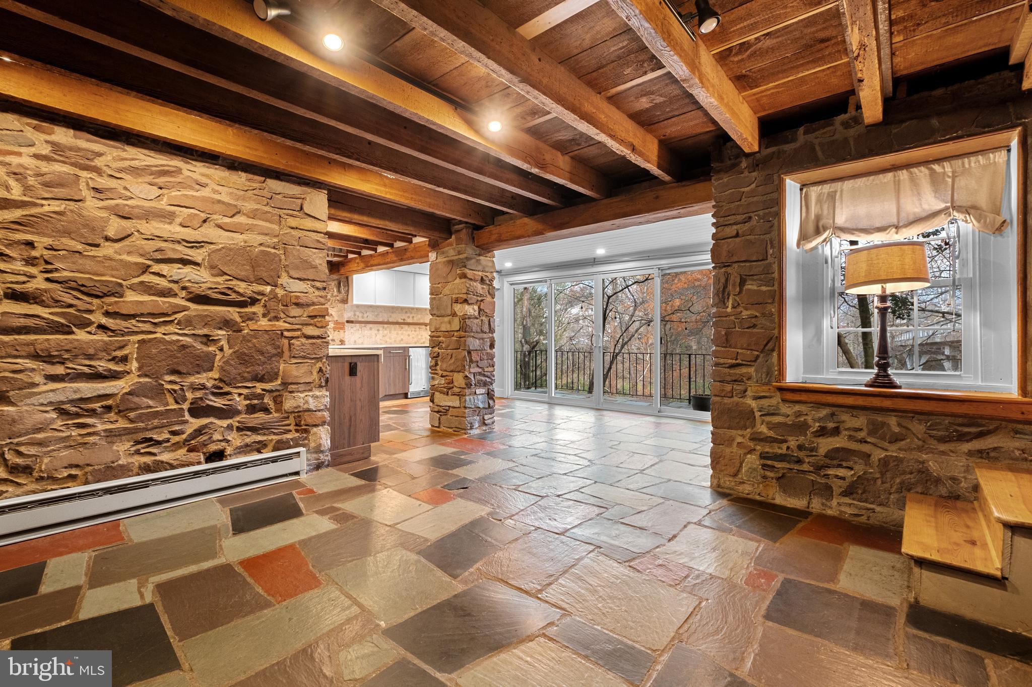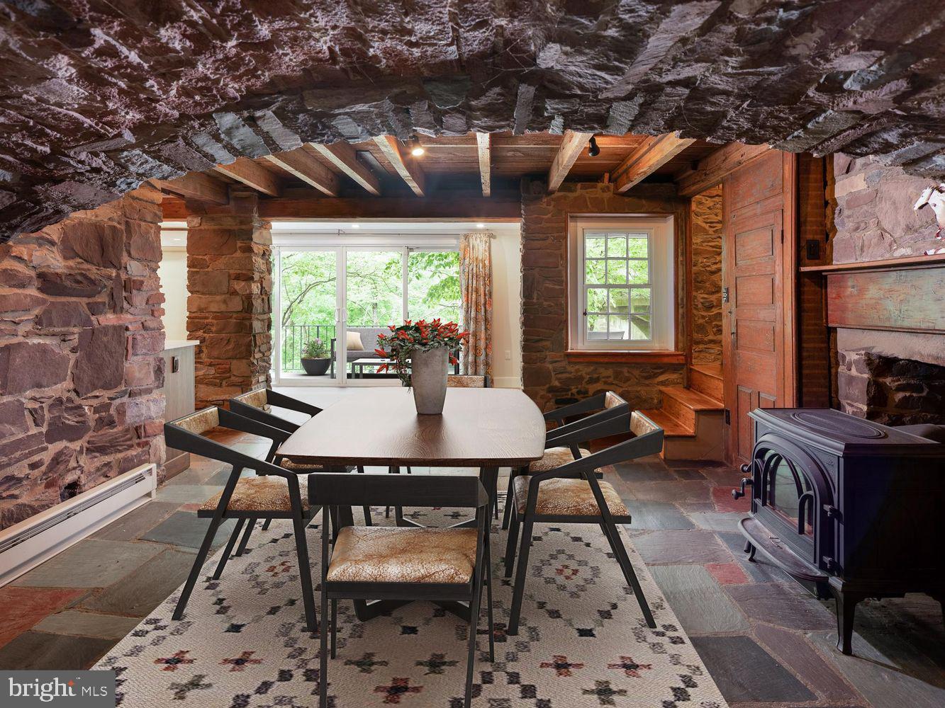 Inside, the home features a large living room and a rare first bedroom suite complete with a full bath and walk-in shower. The kitchen is the heart of the home, showcasing original stonework, an authentic wood-burning fireplace, a breakfast nook with island seating, and an adjacent dining area that opens through sliding glass doors to the outdoor patio. Outside, enjoy a hot tub, expansive backyard, and serene creek views - a true escape right in town.